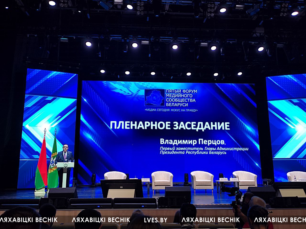 Першы намеснік Кіраўніка Адміністрацыі Прэзідэнта Рэспублікі Беларусь Уладзімір Пярцоў зачытаў прывітанне, накіраванае ўдзельнікам форуму Прэзідэнтам Беларусі. «У эпоху постпраўды ваш форум з’яўляецца ўнікальнай пляцоўкай для абмену вопытам, абмеркавання тэндэнцый і стратэгіі развіцця нацыянальнай інфармацыйнай прасторы, дае магчымасць па заслугах адзначыць уменні майстроў друкаванага слова», – гаворыцца ў прывітанні. Уладзімір Пярцоў у сваім выступленні ўзняў шэраг важных тэм і адзначыў, што за час з папярэдняга форуму зроблена нямала: маштабаваны юнкараўскі рух, удас-каналена нарматыўна-прававая база па ўзаемадзеянні з органамі ўлады, пашыраны фармат самога форуму. І гэта для таго, каб зрабіць медыяіндустрыю больш эфектыўнай і прадукцыйнай. Першы намеснік Кіраўніка Адміністрацыі Прэзідэнта падкрэсліў, што сёння журналісты дзяржаўных СМІ – гэта адзіная і магутная сіла, якая сваёй працай і талентам здольная супрацьстаяць фэйкам і дэструктыўнай інфармацыі. Акцэнтавана ўвага і на стварэнні юнкараўскіх гурткоў і школ – будучыні журналістыкі нашай краіны.