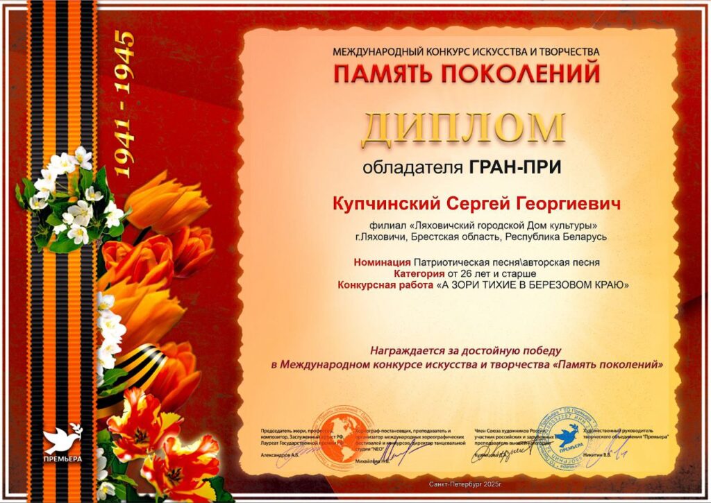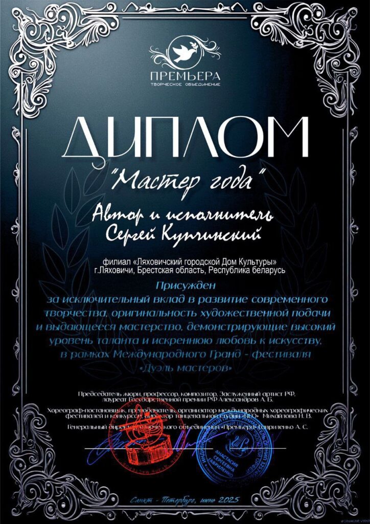 Также Сергей Купчинский стал обладателем гран-при Международного конкурса искусства и творчества “Память поколений” в номинации “Патриотическая песня /авторская песня”. Наш земляк написал музыку к песне “А зори здесь тихие в березовом краю”. Буквально на днях пришла грандиозная новость. Автор и исполнитель Сергей Купчинский (Ляховичский городской Дом культуры) завоевал диплом “Мастер года”. Награда присуждена “за исключительный вклад в развитие современного творчества, оригинальность художественной подачи и выдающееся мастерство, демонстрирующее высокий уровень таланта и искреннюю любовь к искусству, в рамках Международного гранд-фестиваля “Дуэль мастеров”.