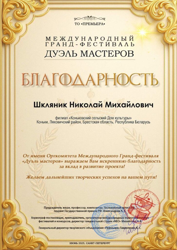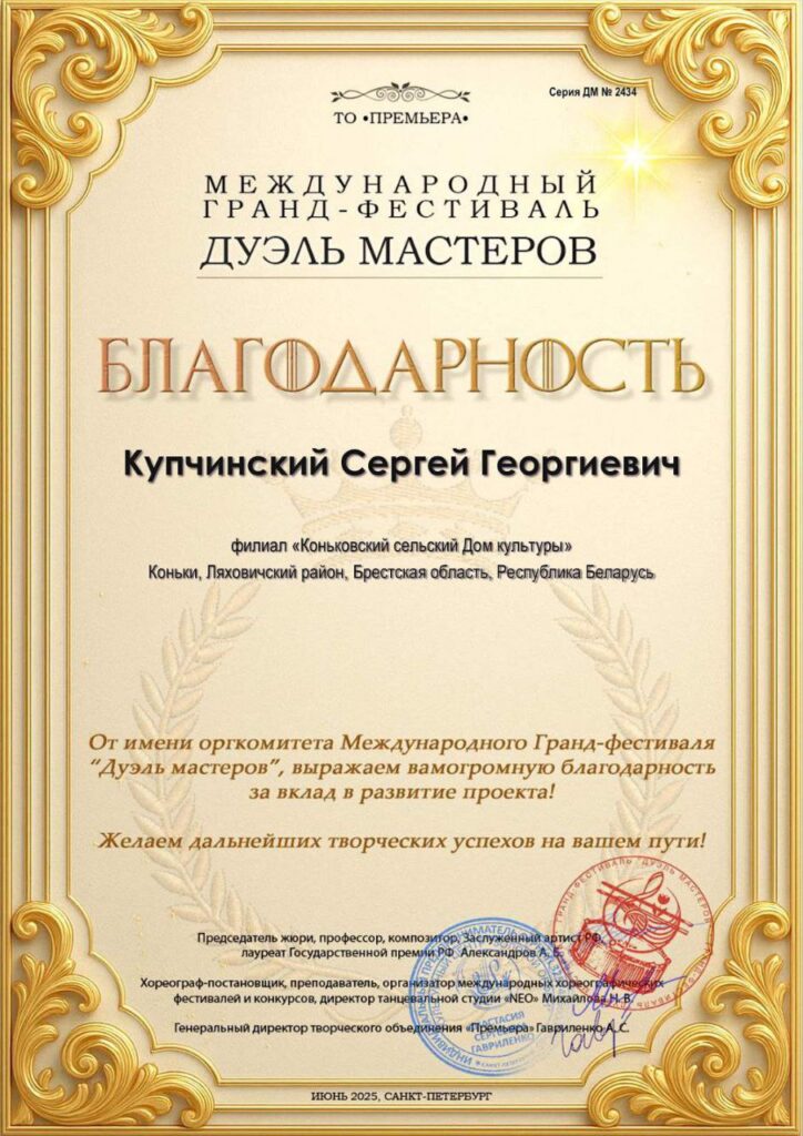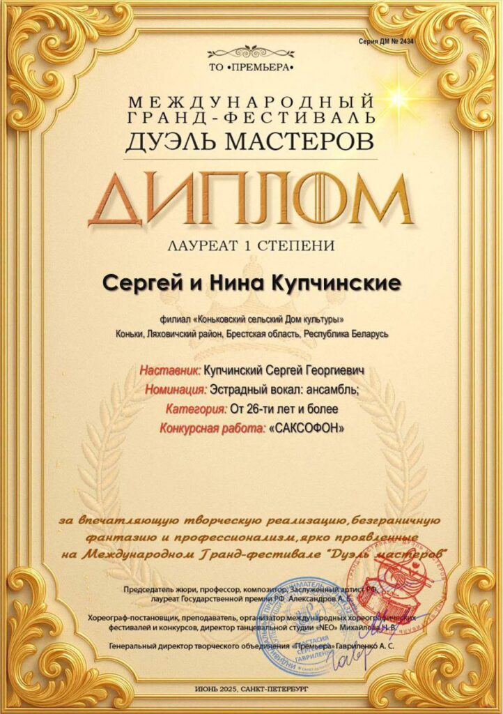 Среди букета наград – диплом лауреата I степени в номинации “эстрадный вокал: ансамбль” Международного гранд-фестиваля «Дуэль мастеров» . Гранд – конкурс- это фестиваль среди победителей конкурсов за 2024-2025 годы. Сергей в дуэте с женой Ниной исполнили песню “Саксофон”. Участие в номере принял и наш земляк Николай Шкляник. На конкурсе наши талантливые артисты предсьавляли Коньковский СДК.