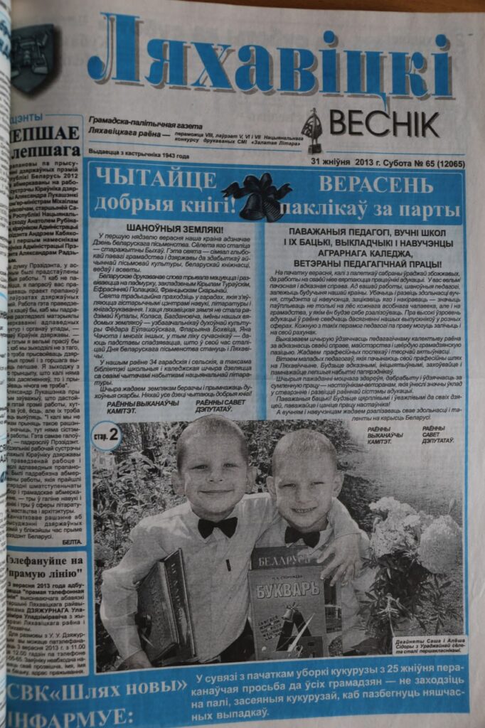 «Двайняты Саша і Лёша Сідоры з Ураджайнай сёлета сталі першакласнікамі» — жыццярадаснае фота з такім надпісам упрыгожыла першую старонку «Ляхавіцкага весніка» за 31 жніўня 2013 года.