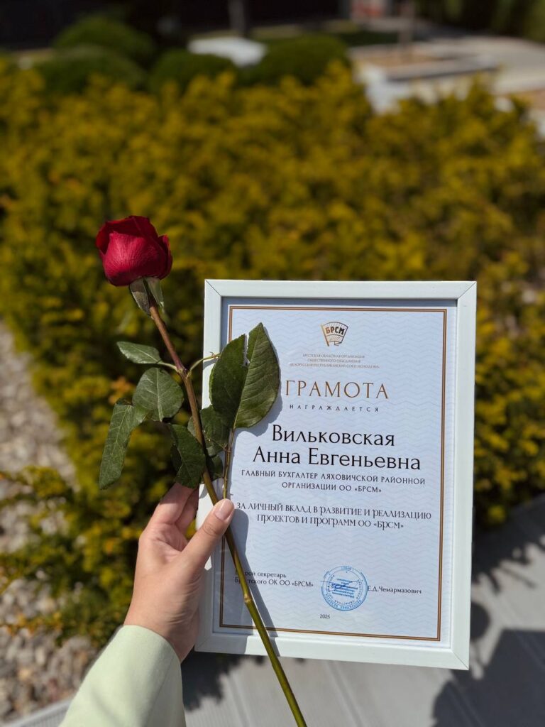 Главный бухгалтер Ляховичской районной организации «БРСМ» Анна Вильковская награждена Грамотой Брестской областной организации общественного объединения «Белорусский республиканский союз молодёжи» за личный вклад в развитие и реализацию проектов и программ ОО «БРСМ».