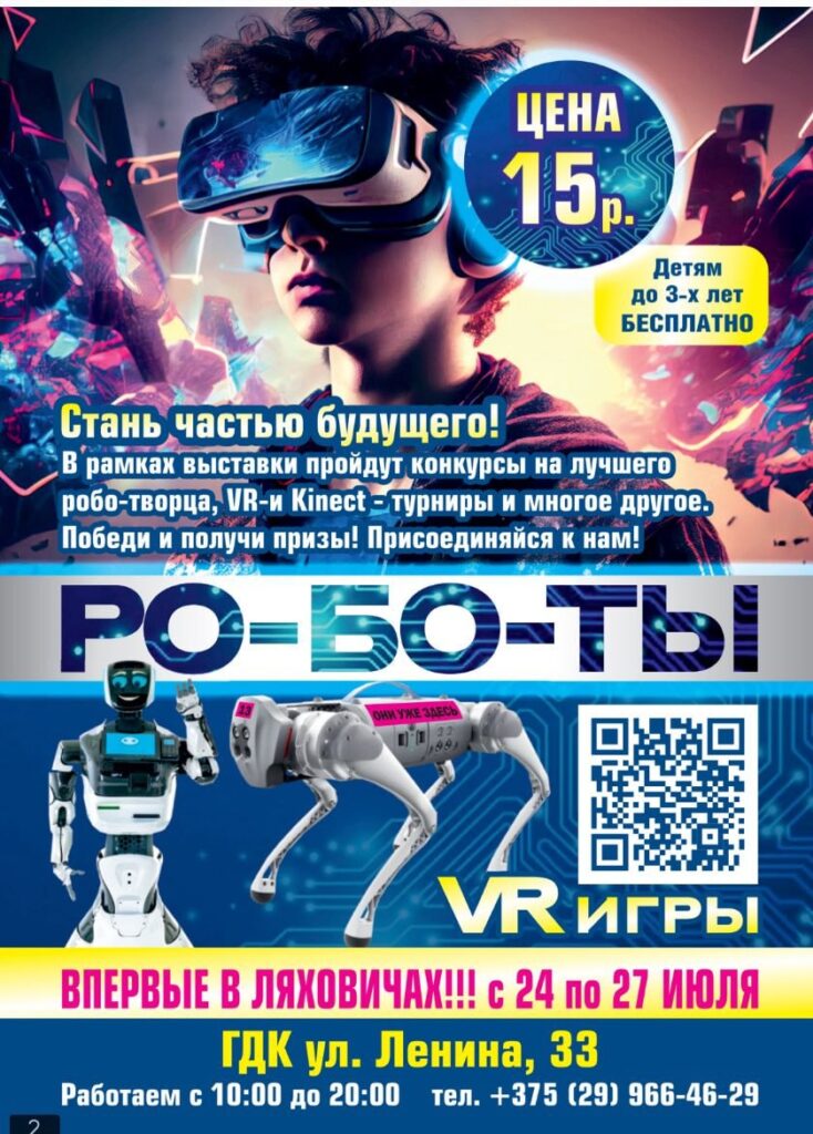 Получите бесплатный билет на две персоны на захватывающую выставку роботов и VR игр, которая впервые состоится в Ляховичах в ГДК с 24 по 27 июля. Розыгрыш проводится в телеграм-канале Новости Ляховичи — Ляхавіцкі веснік.