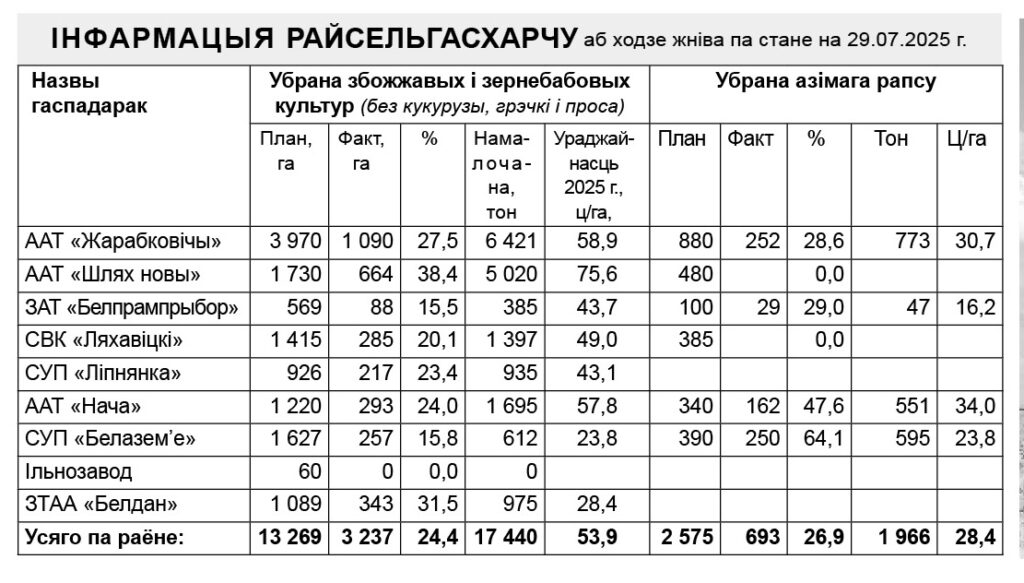 Навіны Сельская гаспадарка Па стане на 29 ліпеня хлебаробы Ляхавіччыны намалацілі 17 440 тон збожжа 29/07/2025 264 redakcyja