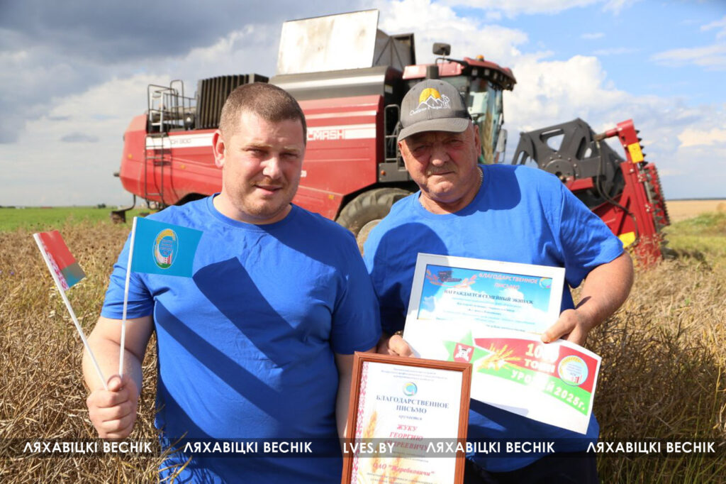 Поздравления принимали Георгий Жук и Андрей Жук. Сын и отец ударно трудятся на полях ОАО «Жеребковичи».