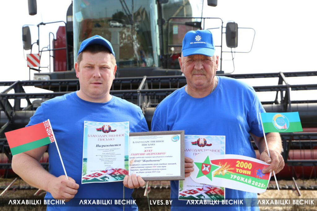 Перед началом рабочего дня на поле в ОАО «Жеребковичи» поздравления принимал лучший семейный экипаж Ляховичского района — Георгий Жук и Андрей Жук.