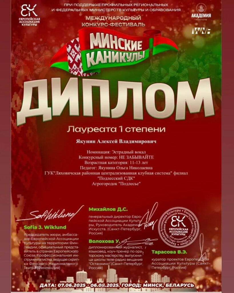 Диплом 1 степени получил юный участник художественной самодеятельности филиала «Подлесский СДК» ГУК»Ляховичская районная централизованная клубная система » Алексей Якунин за участие в международном конкурсе-фестивале «Минские каникулы».