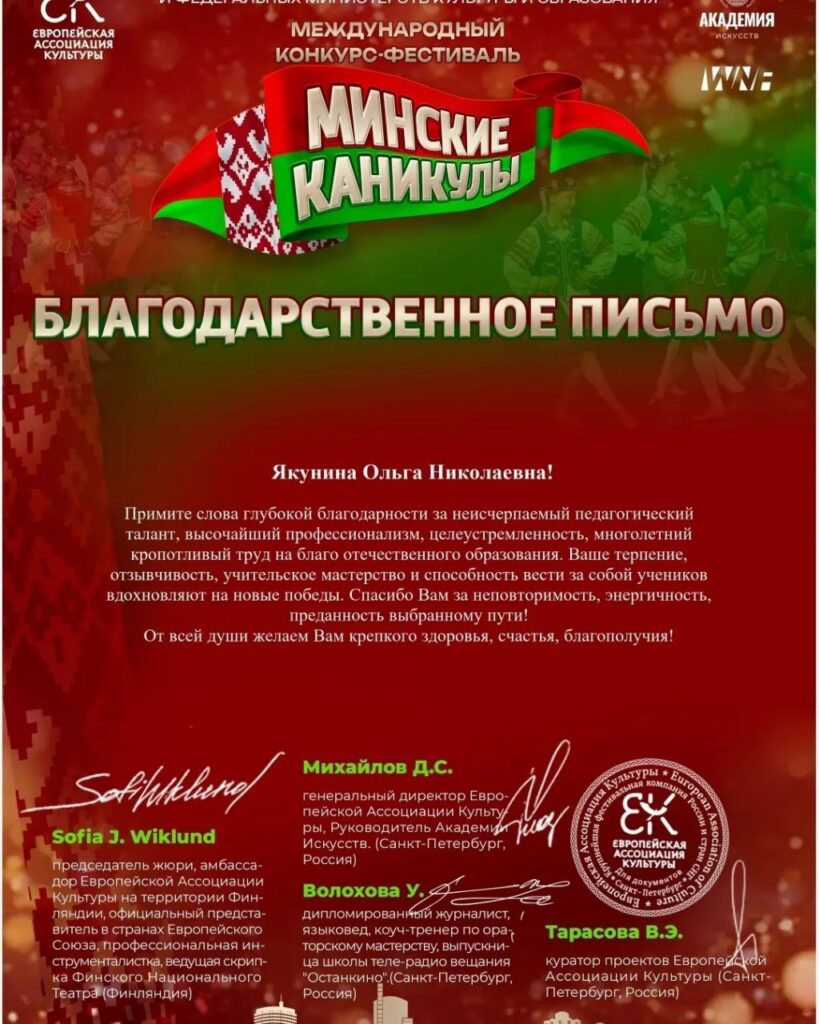 Руководитель Ольга Якунина отмечена благодарственным письмом