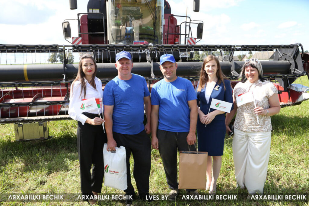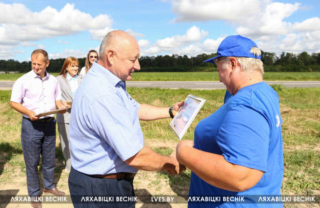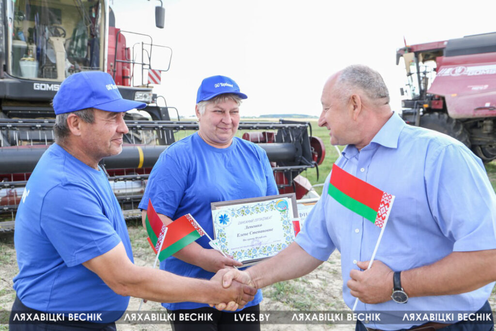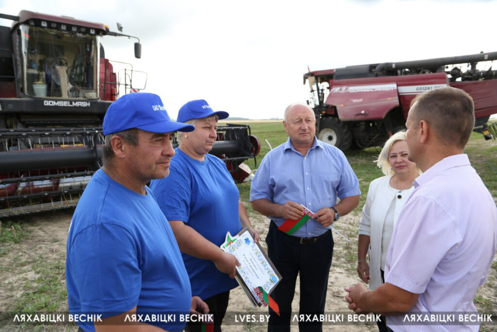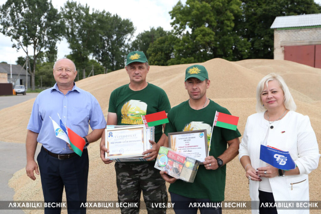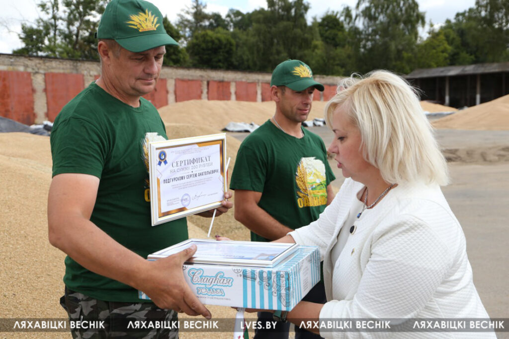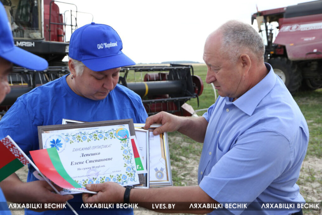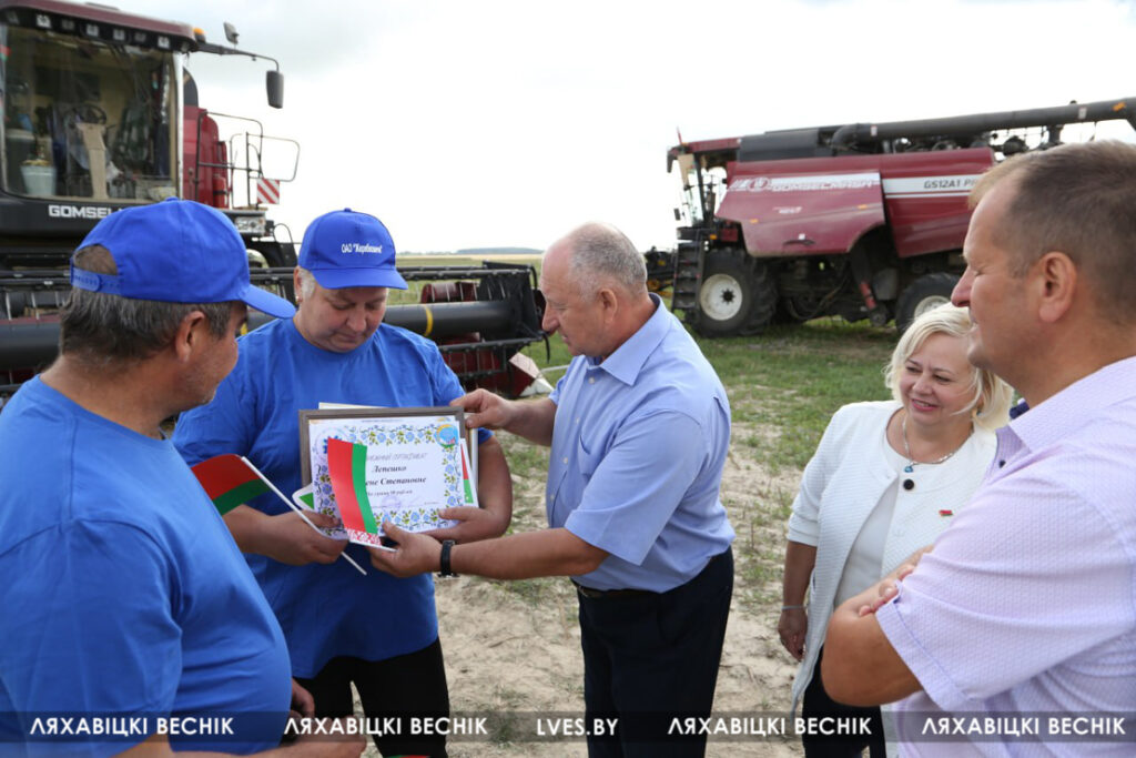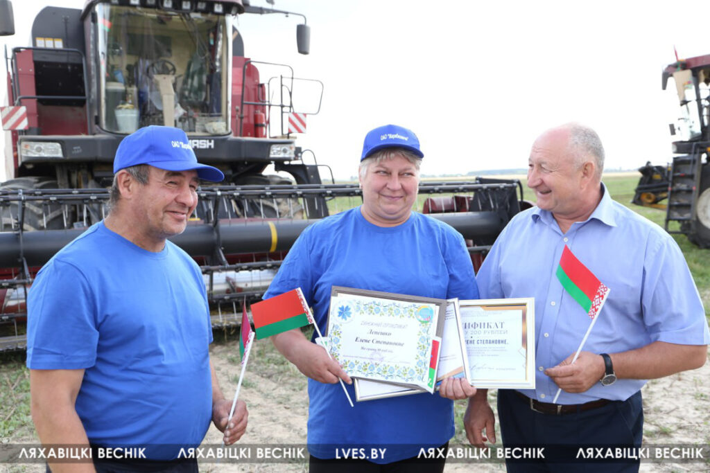 С приветственными словами к участникам жатвы– работникам учреждений образования Ляховиччины – обратился председатель Брестской областной организации профсоюза работников образования и науки Иван Василенко. Он вручил от обкома профсоюза денежный сертификат за активное участие в уборочной кампании повару Жеребковичской СШ имени М.Г. Минкевича Елене Лепешко и учителю Начевской СШ Сергею Подгурскому. От районного отраслевого профсоюза Людмила Хмарук передала труженикам Благодарности и сладкие подарки. Напарники этих аграриев – Александр Лепешко и Роман Голя принимали поздравления и подарки от первого заместителя председателя Ляховичского райисполкома –начальника управления по сельскому хозяйству и продовольствию Василия Пыжика и от профсоюзного лидера ляховичских аграриев Ольги Аникей.