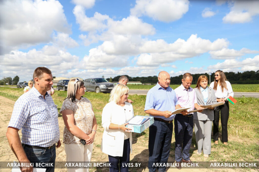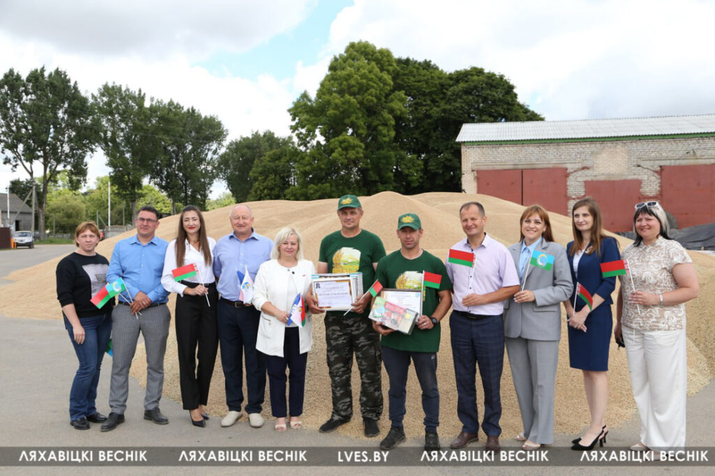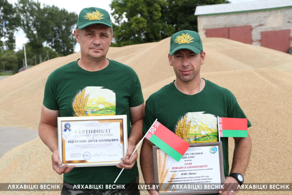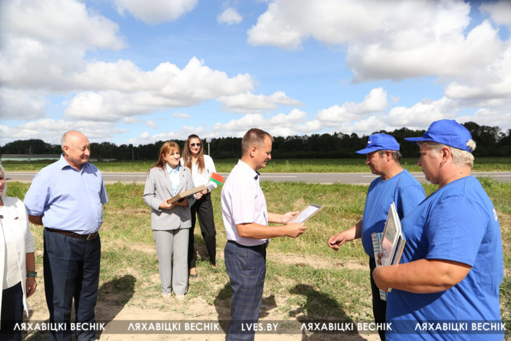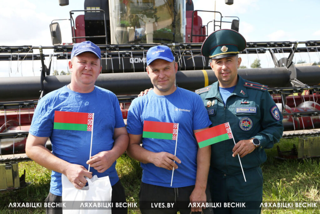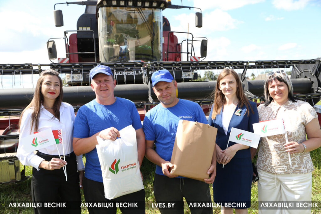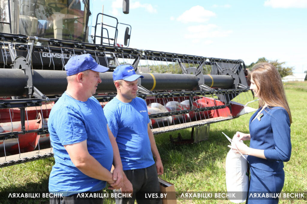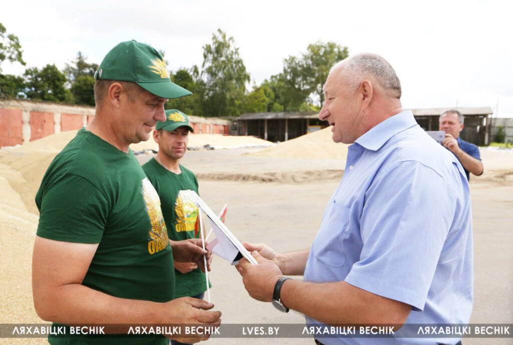 С приветственными словами к участникам жатвы– работникам учреждений образования Ляховиччины – обратился председатель Брестской областной организации профсоюза работников образования и науки Иван Василенко. Он вручил от обкома профсоюза денежный сертификат за активное участие в уборочной кампании повару Жеребковичской СШ имени М.Г. Минкевича Елене Лепешко и учителю Начевской СШ Сергею Подгурскому. От районного отраслевого профсоюза Людмила Хмарук передала труженикам Благодарности и сладкие подарки. Напарники этих аграриев – Александр Лепешко и Роман Голя принимали поздравления и подарки от первого заместителя председателя Ляховичского райисполкома –начальника управления по сельскому хозяйству и продовольствию Василия Пыжика и от профсоюзного лидера ляховичских аграриев Ольги Аникей.