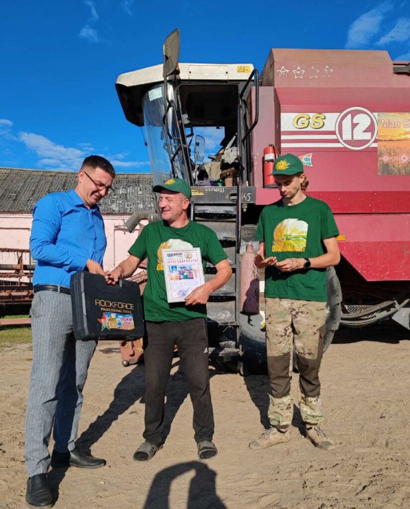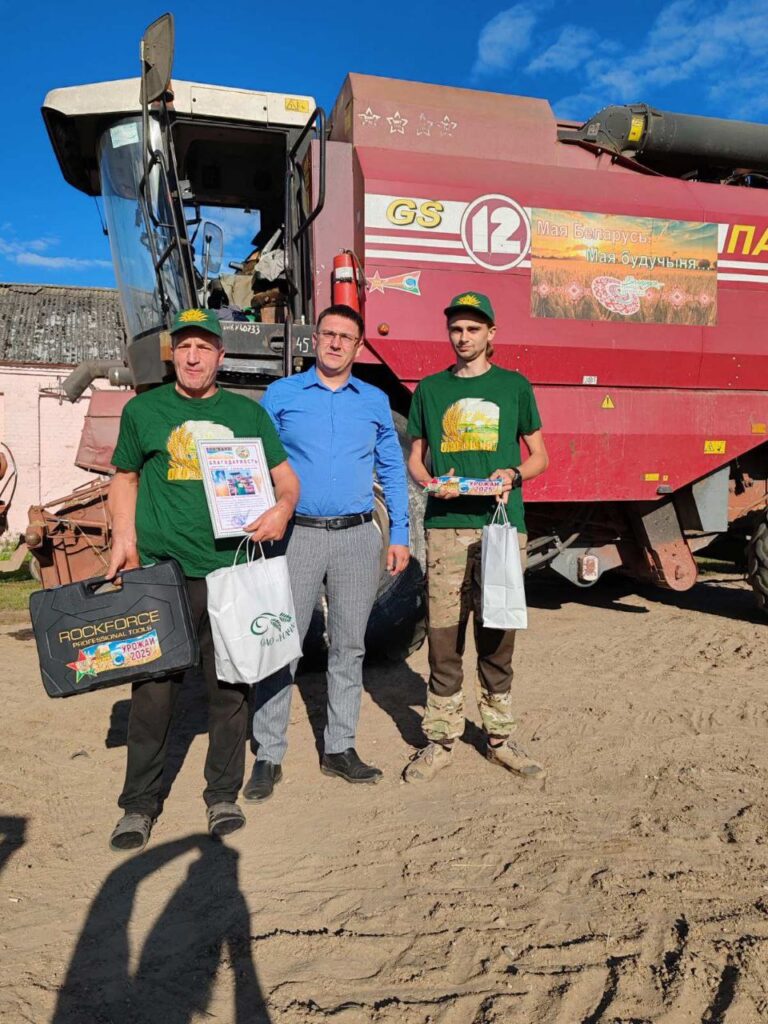 Успехи хлеборобов не остаются незамеченными. Сегодня в хозяйстве чествовали экипаж-тысячник КЗС’-1218 в составе комбайнеров Александра Ясинского и Владислава Васюкевича.