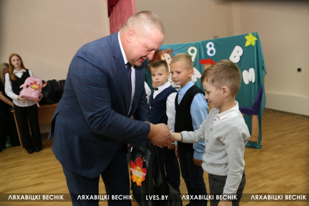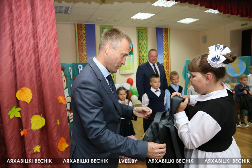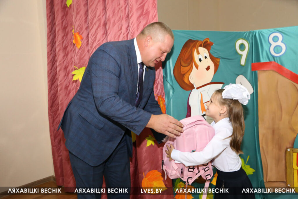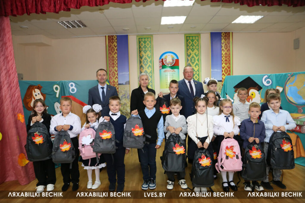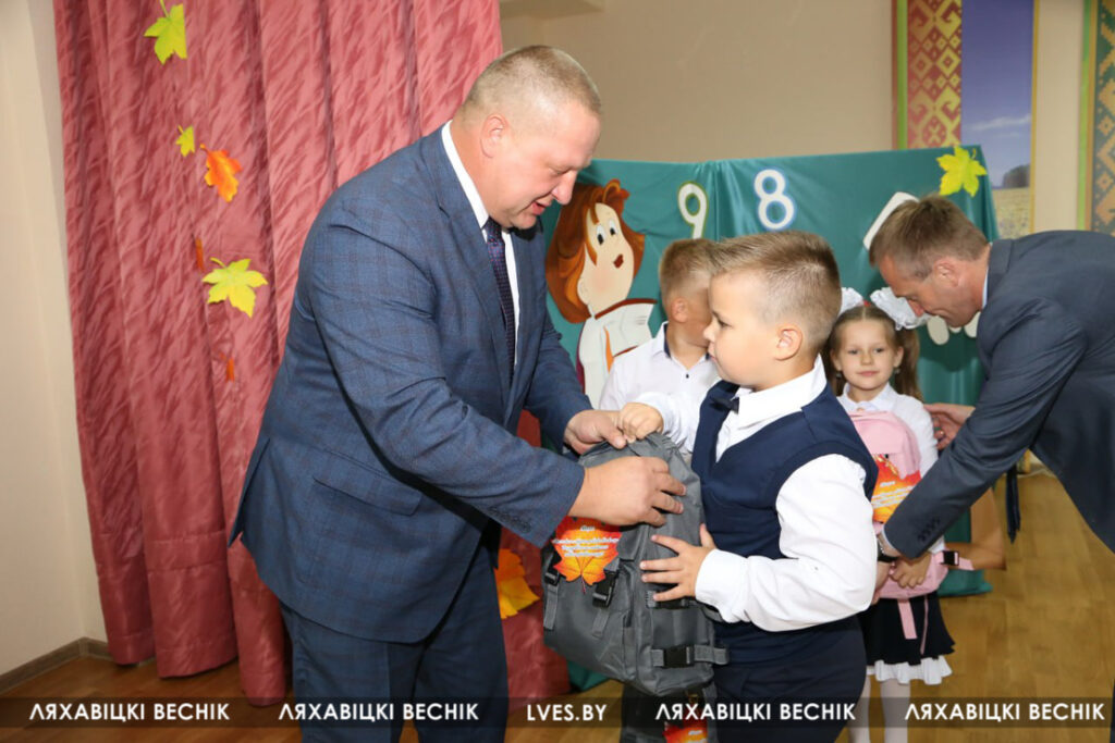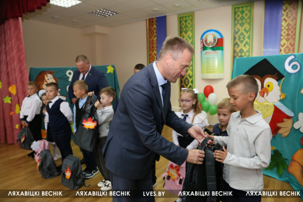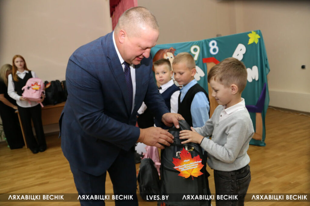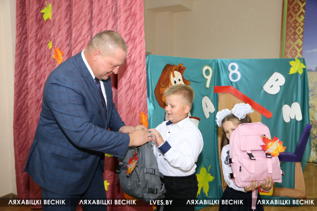 Председатель Ляховичского райисполкома Николай Мороз и заместитель председателя райисполкома Олег Третьяк вручили мальчикам и девочкам школьные ранцы с канцелярскими принадлежностями.