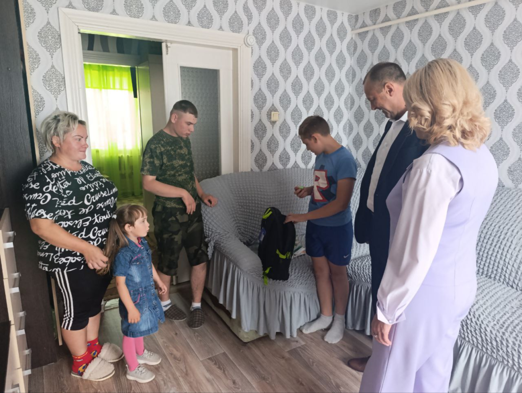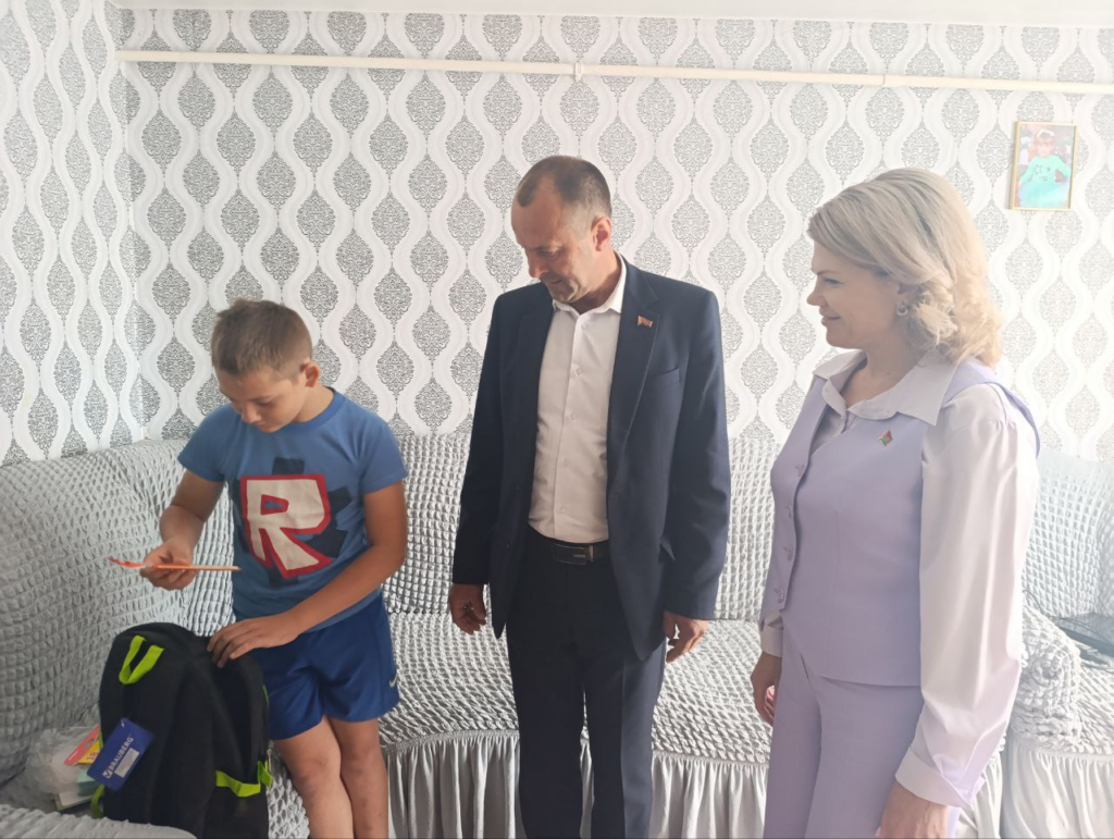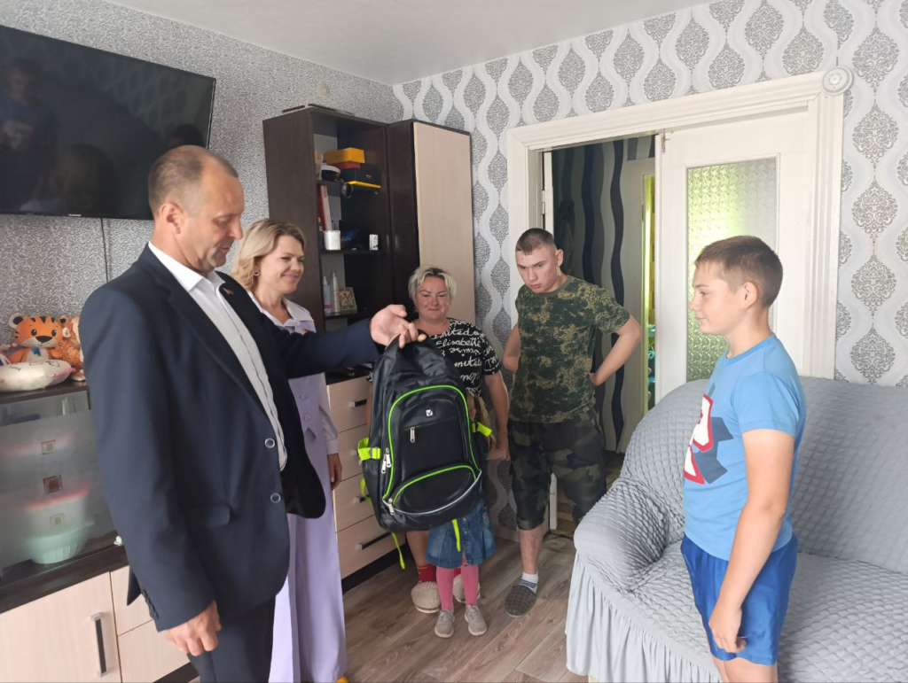 В рамках акции «Соберём портфель вместе» председатель райсовета Юрий Черенкевич и начальник отдела по образованию Мария Сороковик посетили семью Городничук в аг.Тальминовичи. В семье воспитывают троих детей. Учащемуся 7 класса вручили портфель со школьными принадлежностями и пожелали отличной учебы.