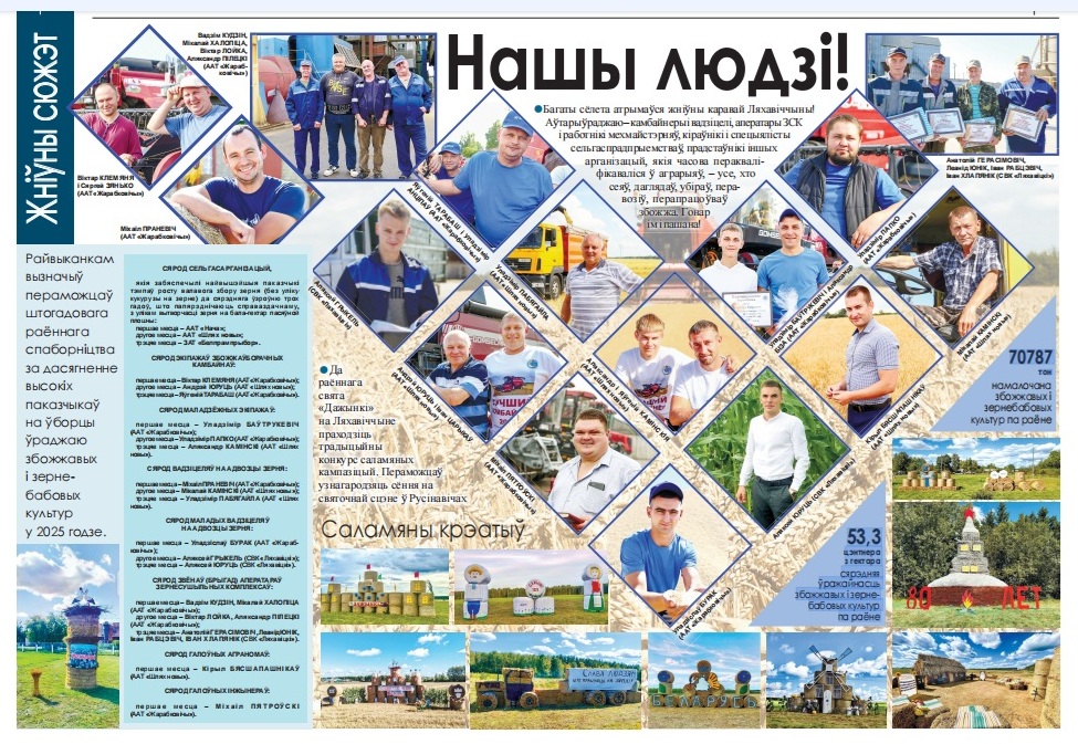 ●Багаты сёлета атрымаўся жніўны каравай Ляхавіччыны! Аўтары ўраджаю – камбайнеры і вадзіцелі, аператары ЗСК і работнікі мехмайстэрняў, кіраўнікі і спецыялісты сельгаспрадпрыемстваў, прадстаўнікі іншых арганізацый, якія часова пераквалі-фікаваліся ў аграрыяў, – усе, хто сеяў, даглядаў, убіраў, пера-возіў, перапрацоўваў збожжа. Гонар ім і пашана!