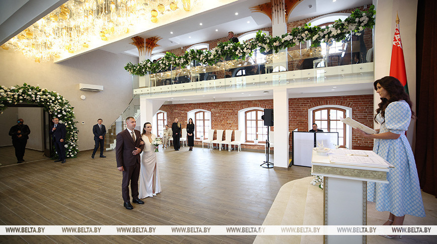 Александр Лукашенко посетил зал торжественных мероприятий. Здесь как раз проходила церемония бракосочетания.