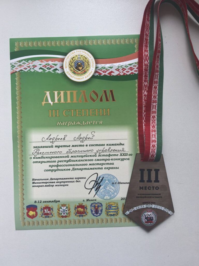 Сегодня на минском стадионе «Динамо» прошла церемония награждения победителей XXII Открытого республиканского смотра-конкурса профмастерства работников Департамента охраны. Среди них и старший инспектор группы милицейской, военизированной и сторожевой охраны отделения по охране объектов в г.Ляховичи Барановичского отделения Департамента охраны МВД Андрей Андреев.