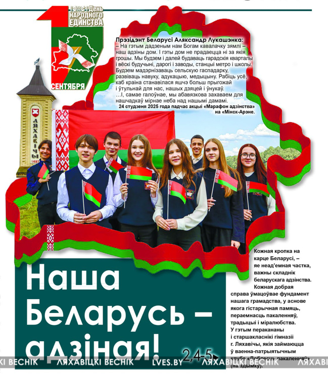 Кожная кропка на карце Беларусі, – яе неад’емная частка, важны складнік беларускага адзінства. Кожная добрая справа ўмацоўвае фундамент нашага грамадства, у аснове якога гістарычная памяць, пераемнасць пакаленняў, традыцыі і міралюбства.
