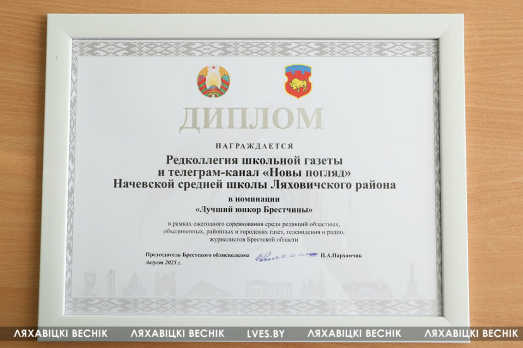 «Новы погляд» атрымаў важкую ўзнагароду! Рэдкалегія школьнай газеты і тэлеграм-канал «Новы погляд» Начаўскай СШ перамаглі ў намінацыі «Лепшы юнкар Брэстчыны» ў штогадовым абласным спаборніцтве сярод рэдакцый абласных, аб’яднаных, раённых і гарадскіх газет, тэлебачання і радыё, журналістаў. Дыплом з рук намесніка старшыні Брэсцкага аблвыканкама Віктара Рафаловіча ва ўрачыстай абстаноўцы атрымала намеснік дырэктара Начаўскай СШ Святлана Машэй.