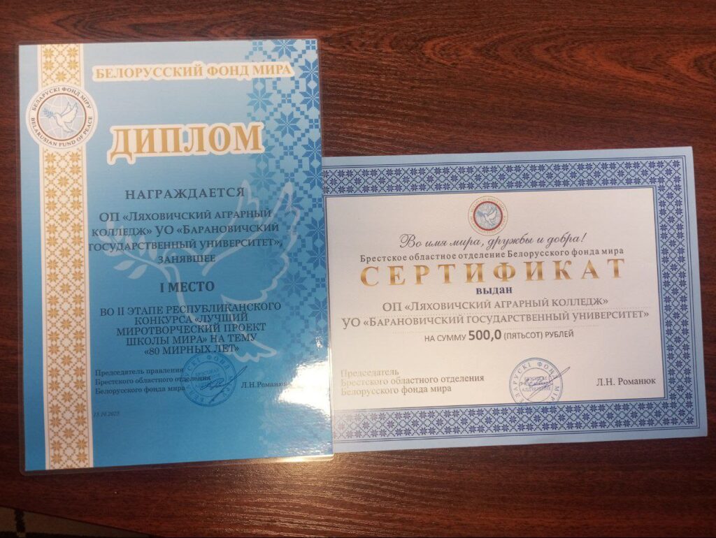 По итогам двухдневных испытаний областного слёта команда Ляховичского аграрного колледжа заняла первое место во втором этапе Республиканского конкурса «Лучший миротворческий проект “Школы мира» на тему «80 лет мира». Учащиеся-миротворцы Жеребковичской СШ имени М.Г. Минкевича награждены Дипломом II степени.