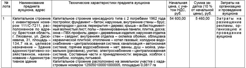 Место, дата, время проведения аукциона: Брестская область, г. Барановичи, ул. Брестская, 186, 8.12.2025 в 12.00.