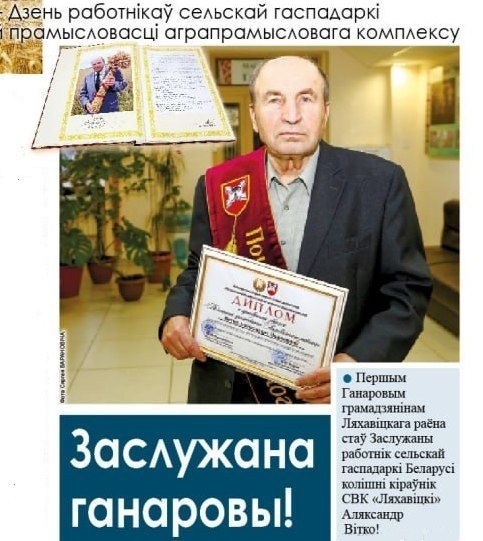 Першым Ганаровым грамадзянінам Ляхавіцкага раёна стаў Заслужаны работнік сельскай гаспадаркі Беларусі колішні кіраўнік СВК «Ляхавіцкі» Аляксандр Вітко!