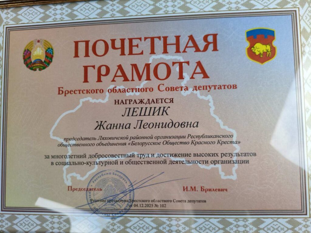 Почетной грамотой Брестского областного Совета депутатов за многолетний добросовестный труд и достижение высоких результатов в социально-культурной и общественной деятельности организации награждена Жанна Лешик.