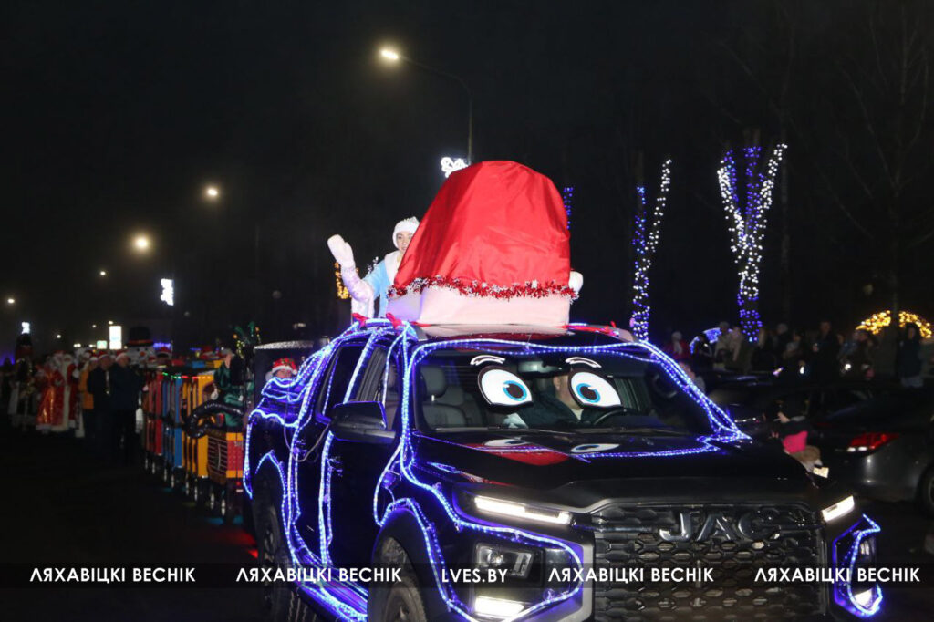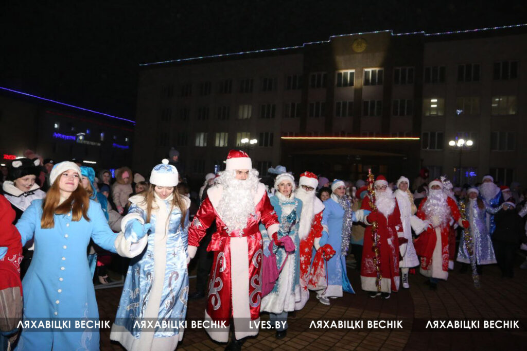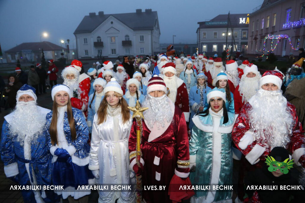 Саната падарыла навагодні настрой. Пад акампанемент аркестра ў Ляхавічах пачалося шэсце казачных герояў, якое ўзначалілі Дзяды Маразы і Снягуркі