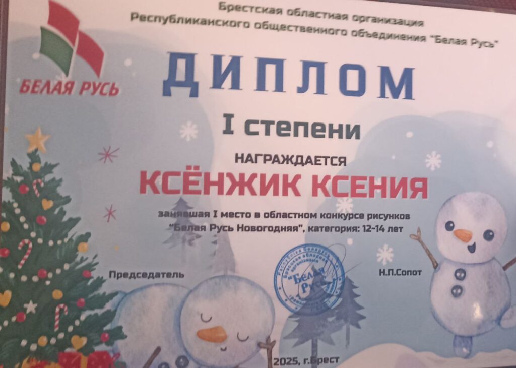 I место в областном конкурсе рисунков «Белая Русь Новогодняя» (категория 12-14 лет).