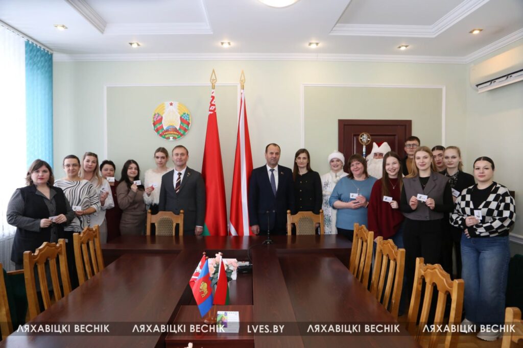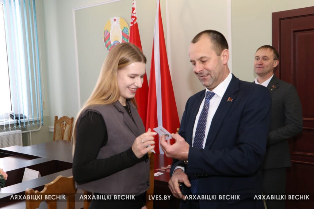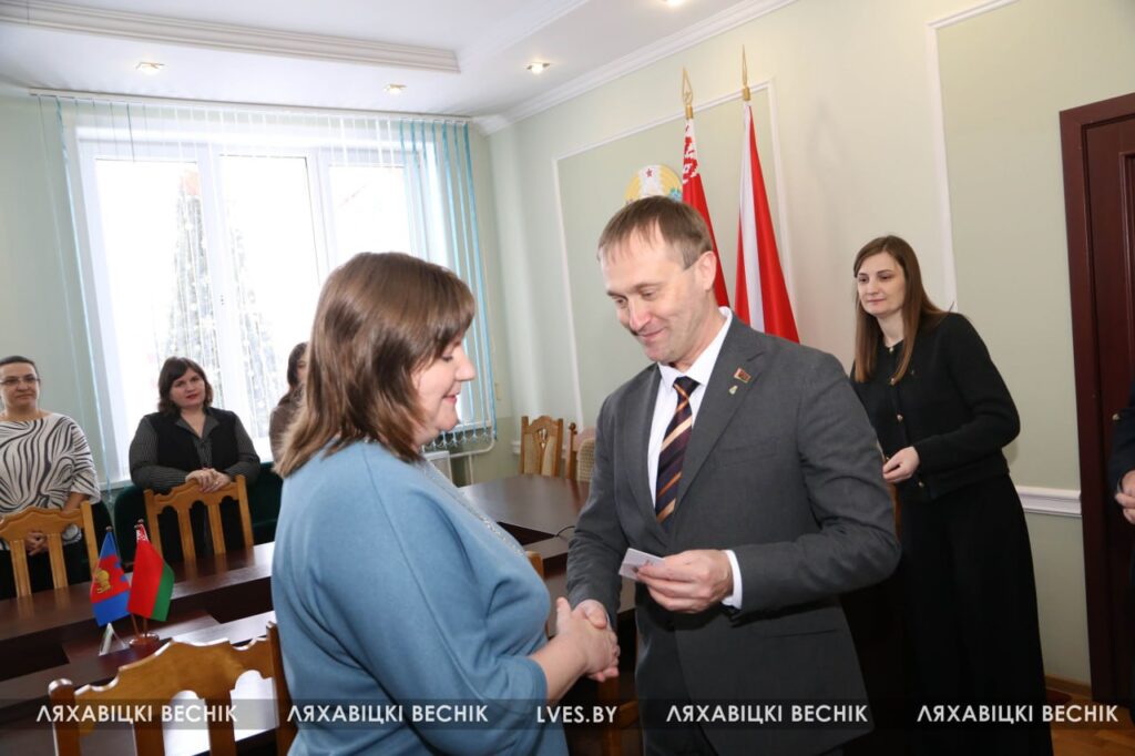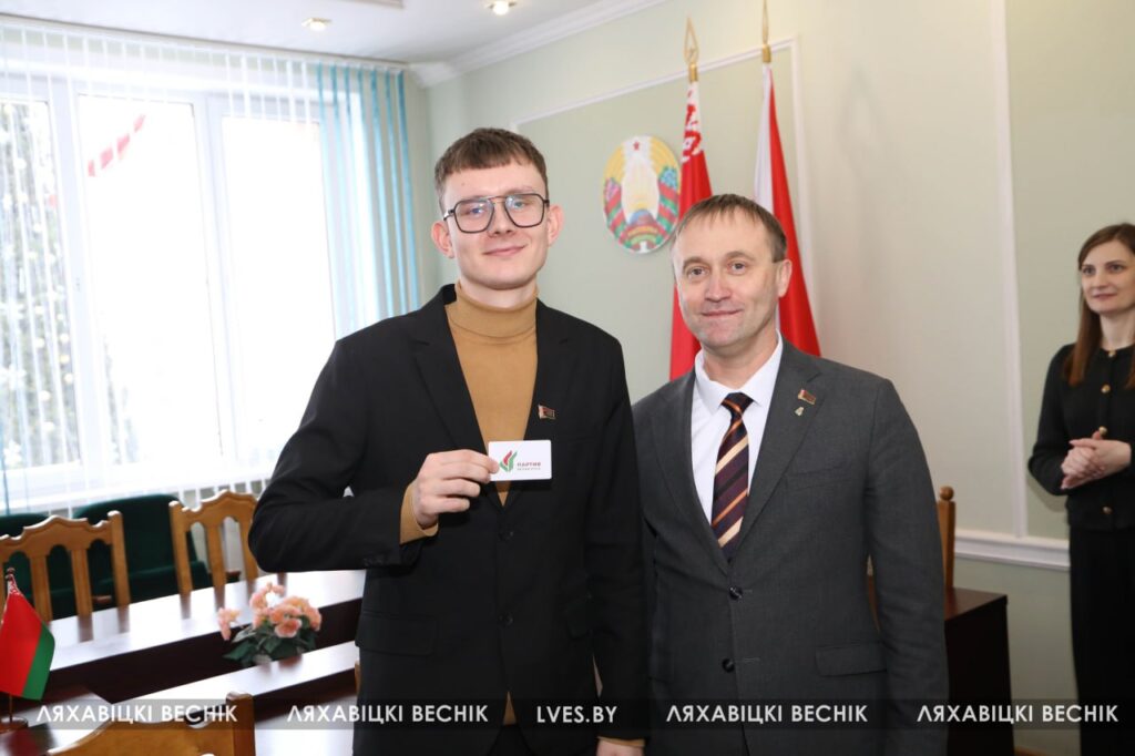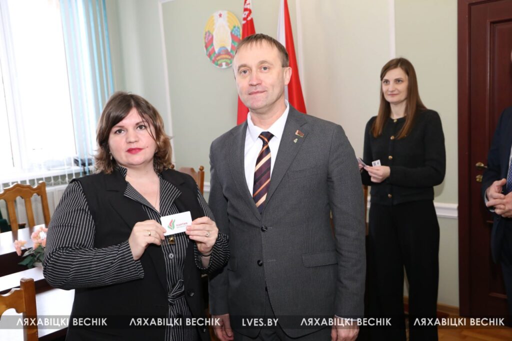 Председатель районного отделения Белорусской партии «Белая Русь» Олег Третьяк и председатель Ляховичского районного Совета депутатов Юрий Черенкевич вручили партийные билеты «Белой Руси» работникам структурных подразделений райисполкома и центра обеспечения деятельности бюджетных организаций Ляховичского района.