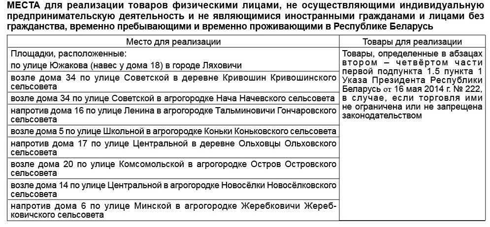 На основании абзаца первого части первой подпункта 1.5 пункта 1 Указа Президента Республики Беларусь от 16 мая 2014 г. № 222 «О регулировании предпринимательской деятельности и реализации товаров индивидуальными предпринимателями и иными физическими лицами» Ляховичский районный исполнительный комитет РЕШИЛ: