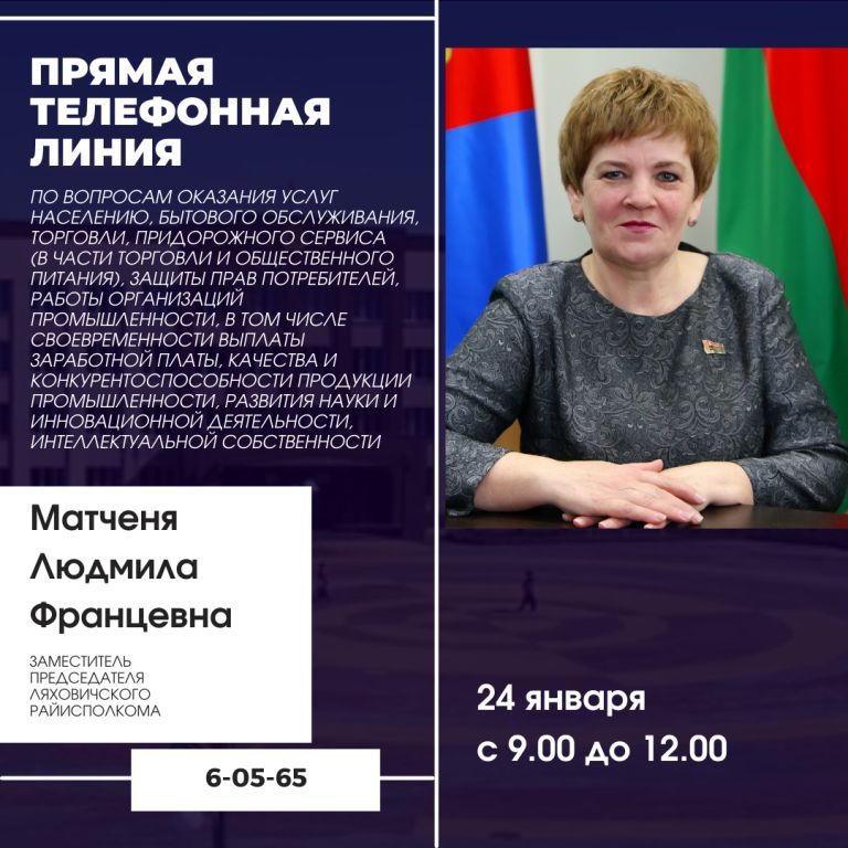 24 студзеня з 9.00 да 12.00 прамую тэлефонную лінію па пытаннях бытавога абслугоўвання, гандлю, абароны правоў спажыўцоў, работы арганізацый прамысловасці, у тым ліку своечасовасці выплаты заработнай платы, якасці і канкурэнтаздольнасці прадукцыі прамысловасці, правядзе намеснік старшыні Ляхавіцкага раённага выканаўчага камітэта МАТЧЭНЯ Людміла Францаўна. Пытанні можна задаць па тэлефоне 6-05-65.