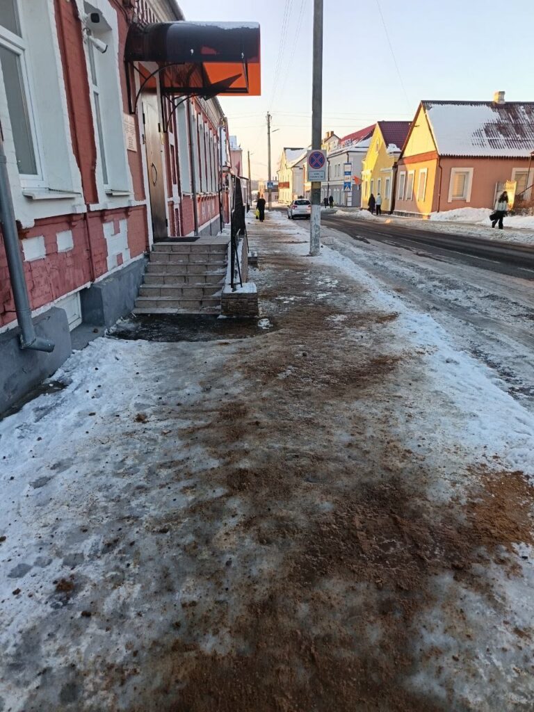 Подписчица «ЛВ» обратила внимание, что из-за наледи проблематично подойти к зданию суда на улице Первомайской в Ляховичах