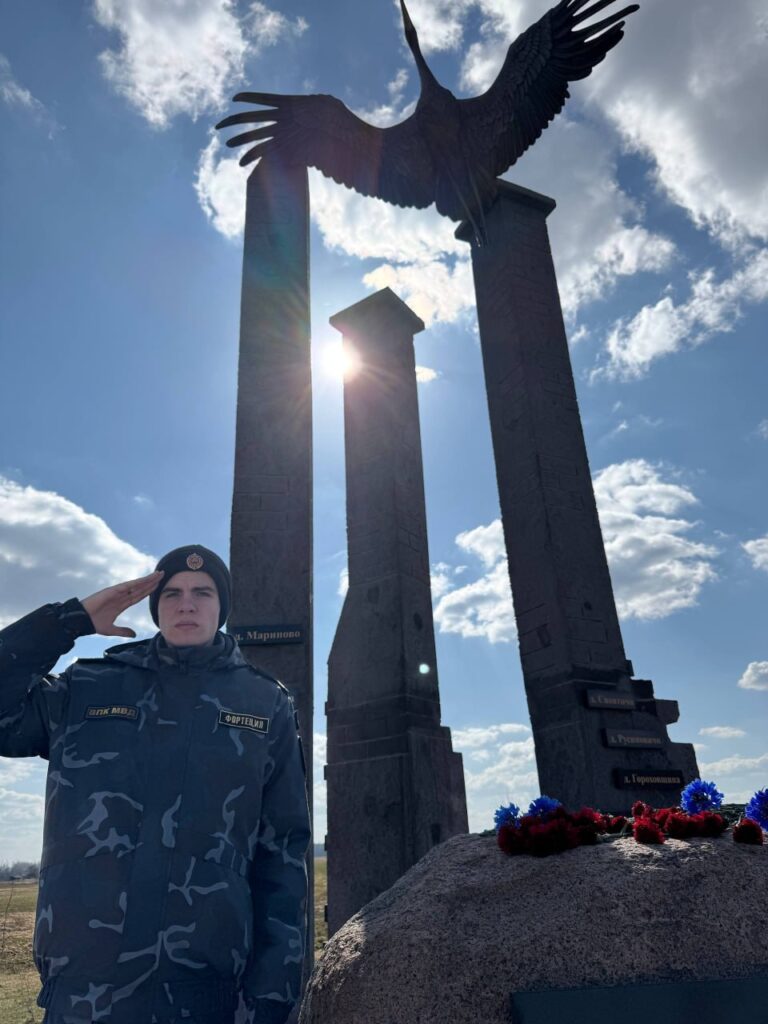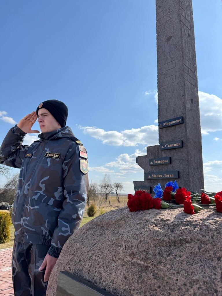 На вахту памяти у знака сожжённым во время Великой Отечественной войны деревням Ляховичского района в Мариново заступили юные ляховичане из ВПК «Фортеция»