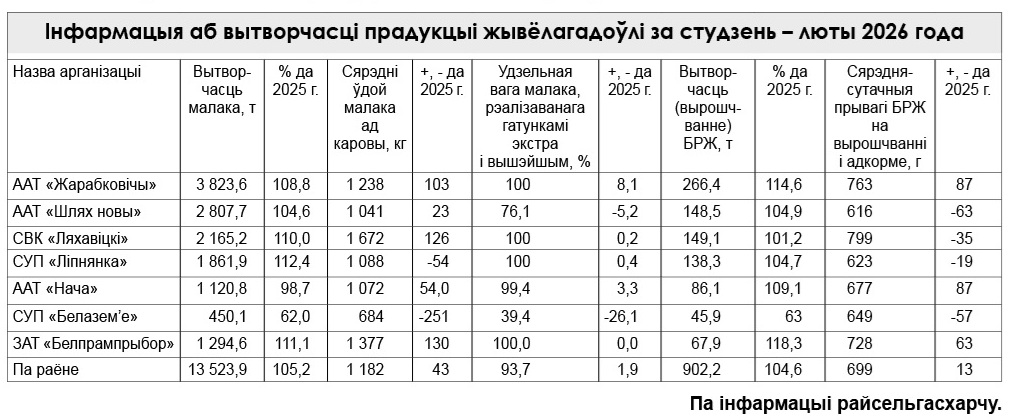 1 358 і тым самым апярэдзіў сярэднераённы на 176 кілаграмаў. Аднак у малакавытворцаў нашага раёна ёсць свае маякі-перадавікі. Напрыклад, ЗАТ «Белпрампрыбор» ад кожнай сваёй каровы атрымаў у студзені – лютым 1 377, а СВК «Ляхавіцкі» і ўвогуле 1 672 кілаграмы самага высакаякаснага малака. Пра высокую якасць малака названых прадпрыемстваў не для чырвонага слоўца: і акцыянернае таварыства, і сельскагаспадарчы кааператыў сваю прадукцыі прадаюць выключна гатункамі экстра і вышэйшым. Прычым з яўным ухілам у бок «экстры».