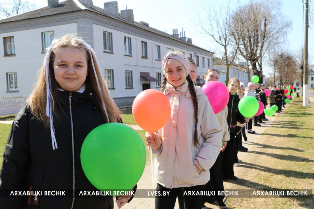 кветкі да Кургана Славы. Мы памятаем! Кожны міг нашага шчаслівага жыцця – гэта ваш бессмяротны подзвіг. На фінальнай кропцы маршруту для моладзі ладзіліся інтэрактыўныя пляцоўкі ад райкама БРСМ, запрашала пачас-тавацца палявая кухня, можна было паспрабаваць свае сілы ў стральбе з пнеўматычнай вінтоўкі. А на святочнай пляцоўцы віталі і віншавалі пераможцаў першага тура рэгіянальнага этапу міжнароднага конкурсу «Космас аб’ядноўвае», прысвечанага 65-годдзю палёту Юрыя Гагарына ў космас.
