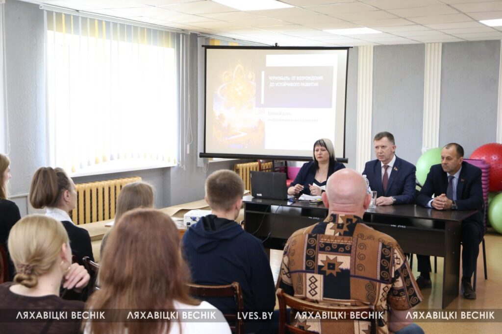 В рамках единого дня информирования Георгий Хлебович, председатель Ляховичского райсовета депутатов Юрий Черенкевич и начальник отдела идеологической работы и по делам молодёжи райисполкома Ольга Бурак встретились с коллективом ДЮСШ Ляховичского района. Тема диалога – «Чернобыль: от возрождения до устойчивого развития».