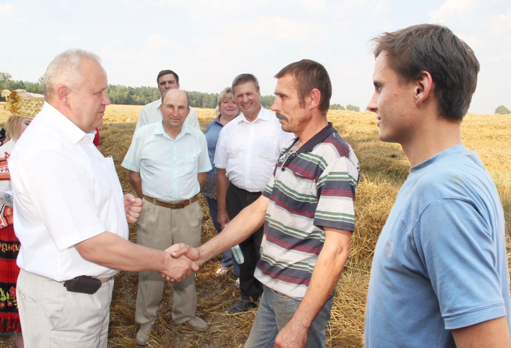 На жніве з ранку да вечара са сваімі працаўнікамі старшыня СВК ”Ляхавіцкі” Аляксандр Вітко. Хто як не ён – Заслужаны работнік сельскай гаспадаркі Беларусі – ведае цану кожнага зярнятка і тое, якой напружанай працай даецца такі важкі ўраджай.