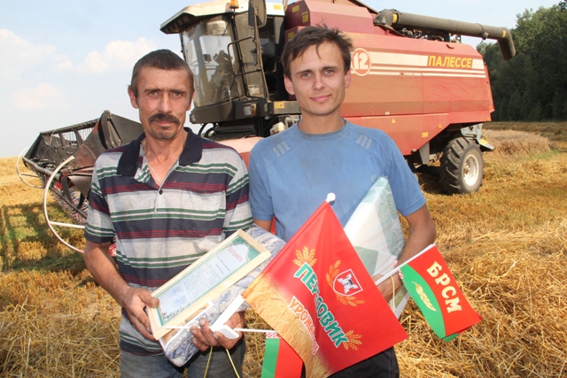 Столькі гасцей залацістыя палеткі з трыцікале, што каля Грушаўкі, не бачылі даўно. Заглушыўшы матор, з кабіны камбайна выходзяць загарэлыя пад жнівеньскім сонцам галоўныя героі гэтага дня – лідары сярод сямейных экіпажаў Сяргей і Андрэй Алейнікі – бацька і сын.
