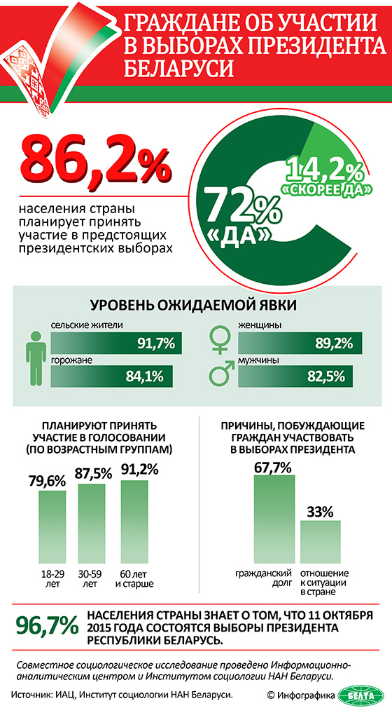 Более 86% населения Беларуси планирует принять участие в предстоящих президентских выборах. Об этом свидетельствуют данные совместного социологического исследования Информационно-аналитического центра и Института социологии Национальной академии наук Беларуси, сообщает БЕЛТА.