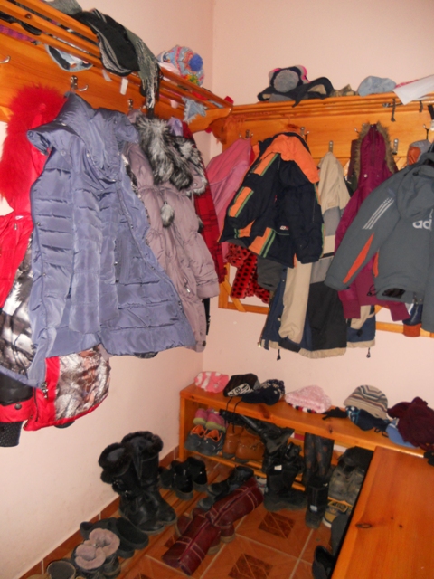 У калідоры ўражвае вялікая колькасць верхняга адзення і абутку, акуратна развешаных і расстаўленых па шматлікіх кручках і паліцах, якія, як і многія іншыя зручнасці, майстарскі вырабіў галава дома.