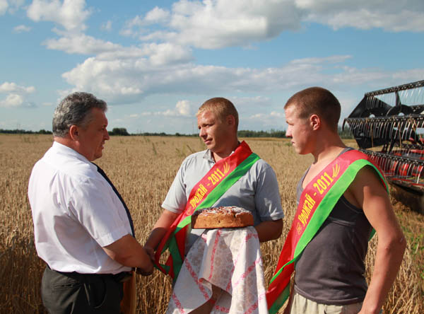 У пятніцу з першай тысячай намалочага зерня сёлетняга ўраджаю віталі сямейны экіпаж у складзе Дзмітрыя і Наталлі Петух з СВК «Шлях новы».