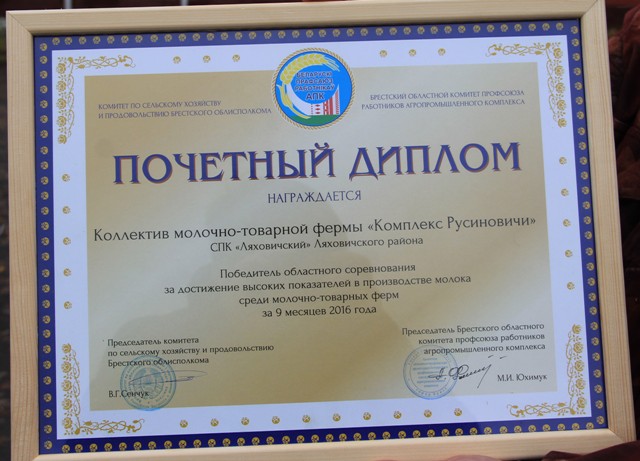 яе ўзровень пасуе лепшым сучасным узорам. Кадравы склад? Кожны з 17 чалавек – тонкі прафесіянал у сузор’і яркага калектыву аднадумцаў. Рызыкнём меркаваць, што іменна гэтыя два “кіты” ляжаць у аснове поспеху МТК “Русінавічы” – вытворчага і эканамічнага.Ушанаванне адбылося ў пятніцу ў памяшканні адміністрацыі СВК. Ва ўрачыста-цёплых абставінах, у прысутнасці кіраўніцтва, спецыялістаў, работнікаў гаспадаркі дыплом памочніку загадчыка МТК Івану Буйко ўручыў намеснік старшыні аблкамітэта прафсаюза работнікаў АПК Аляксей Флар’яновіч (на здымку першы злева). Першы намеснік старшыні камітэта па сельскай гаспадарцы і харчаванні аблвыканкама Сяргей Буткевіч (на здымку ў цэнтры) адзначыў, што поспех русінавіцкіх жывёлаводаў – заканамерны вынік працы ўсіх працаўнікоў “Ляхавіцкага”, пачынаючы ад ці не галоўнага на ферме чалавека – даяркі – да кіраўніка гаспадаркі – мнагавопытнага і заслужанага Аляксандра Іванавіча Вітко.