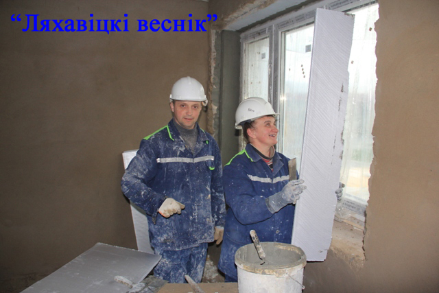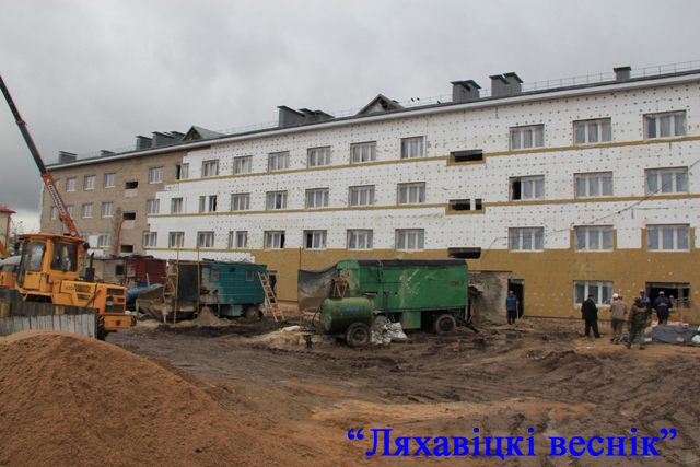Работы па ўцяпленні фасада дома фактычна выходзяць на фінішную прамую. 120-міліметровыя пенаполістырольныя пліты ў якасці цёплай шубы, зманціраваны практычна па ўсім прамавугольным перыметры, па ўсёй вышыні дома. На некаторых сценах выканана арміраванне. Далей і хутка – тынкоўка, дэкаратыўная аддзелка. Прасцей кажучы, афарбоўванне. Адмысловая, аднак, у стылі і канцэпцыі як дамоў, размешчаных па суседстве, так і, увогуле, у варыянце цэласнасці з архітэктурна-дызайнерскім рашэннем добраўпарадкавання цэнтральнай часткі Ляхавіч.