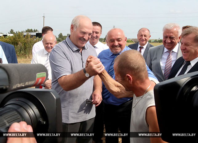 Первая остановка была сделана им на одном из полей хозяйства. Там Александр Лукашенко ознакомился с ходом уборки зерна и пообщался с экипажем комбайнеров — семьей Хоружих. Глава государства поинтересовался, удастся ли им повторить прошлогодний намолот в 1 тыс. т. Николай Хоружий ответил, что это реально. Александр Лукашенко подарил Ирине Хоружей букет цветов и пожелал супругам успехов.
