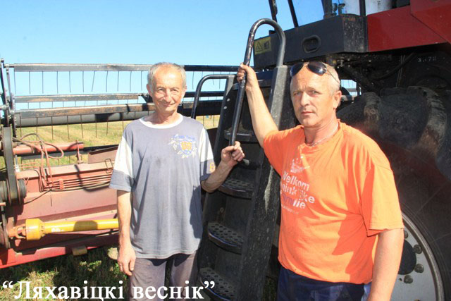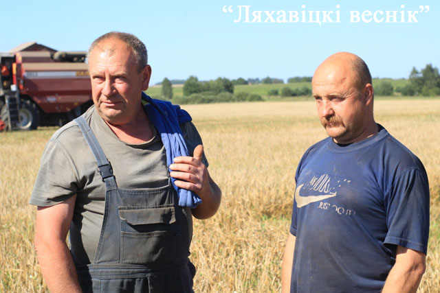 – Знаёмцеся, нашы перадавікі. Аляксандр Русакевіч – галоўны за штурвалам збожжаўборачнай машыны, яго памочнік – Леанід Буйкевіч, – прадстаўляе брыгадзір хлебаробаў, чый камбайн спыніўся на хвіліначку.
