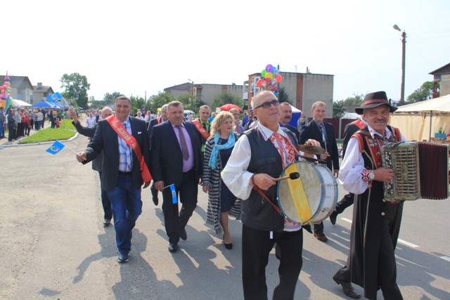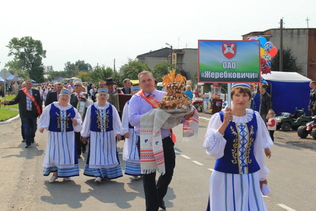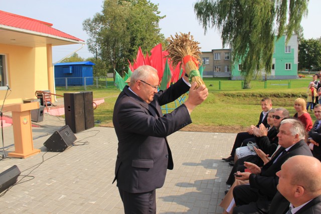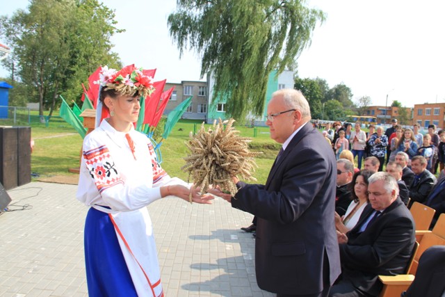 І вось доўгачаканы момант: фанфары абвясцілі пачатак цырымоніі ўшанавання перадавікоў сёлетняга жніва. Па традыцыі каравай, спечаны з мукі новага ўраджаю, уручаецца старшыні раённага выканаўчага камітэта Вячаславу Сельмановічу.