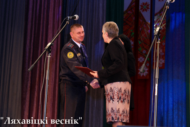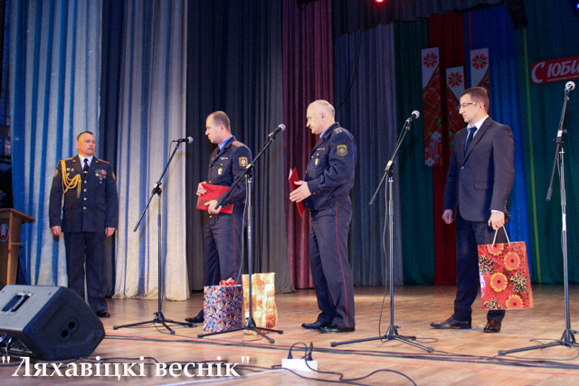 Ад імя Ляхавіцкага райвыканкама супрацоўнікаў дэпартамента павіншавала намеснік старшыні райвыканкама Дзіяна Трысцень і ўручыла падзячныя пісьмы міліцыянеру-вадзіцелю групы затрымання аддзялення па ахове аб’ектаў у горадзе Ляхавічы прапаршчыку міліцыі Ігару Касаковічу, вартаўніку групы міліцэйскай ваенізаванай і вартавой аховы Аляксандру Сафронаву. Першы намеснік начальніка Ляхавіцкага РАУС Андрэй Гіль падзякаваў за якаснае і плённае ўзаемадзеянне з нашым аддзяленнем, яшчэ раз падкрэсліў, што самая мабільная і аператыўная – група затрымання аддзялення аховы. Падзяка начальніка Ляхавіцкага РАУС аб’яўлена міліцыянеру-кінолагу групы затрымання прапаршчыку міліцыі Дзмітрыю Машэю, міліцыянеру-вадзіцелю прапаршчыку міліцыі Віктару Дабравольскаму. Нагрудным знакам «За самаадданую службу» ІІ ступені ўзнагароджаны міліцыянер-вадзіцель прапаршчык міліцыі Валерый Зуйкевіч. Падзякаю прафсаюзнай арганізацыі Баранавіцкага аддзела аховы адзначаны начальнік участка груп міліцэйскай ваенізаванай і вартавой аховы Аляксандр Маляр.