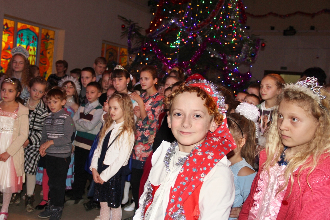 Як жа весела і цікава было на прадстаўленні! Гульні, конкурсы, загадкі, карагоды, вершы і віншаванні каля расквечанай гірляндамі ёлкі – сумаваць не давялося нікому.