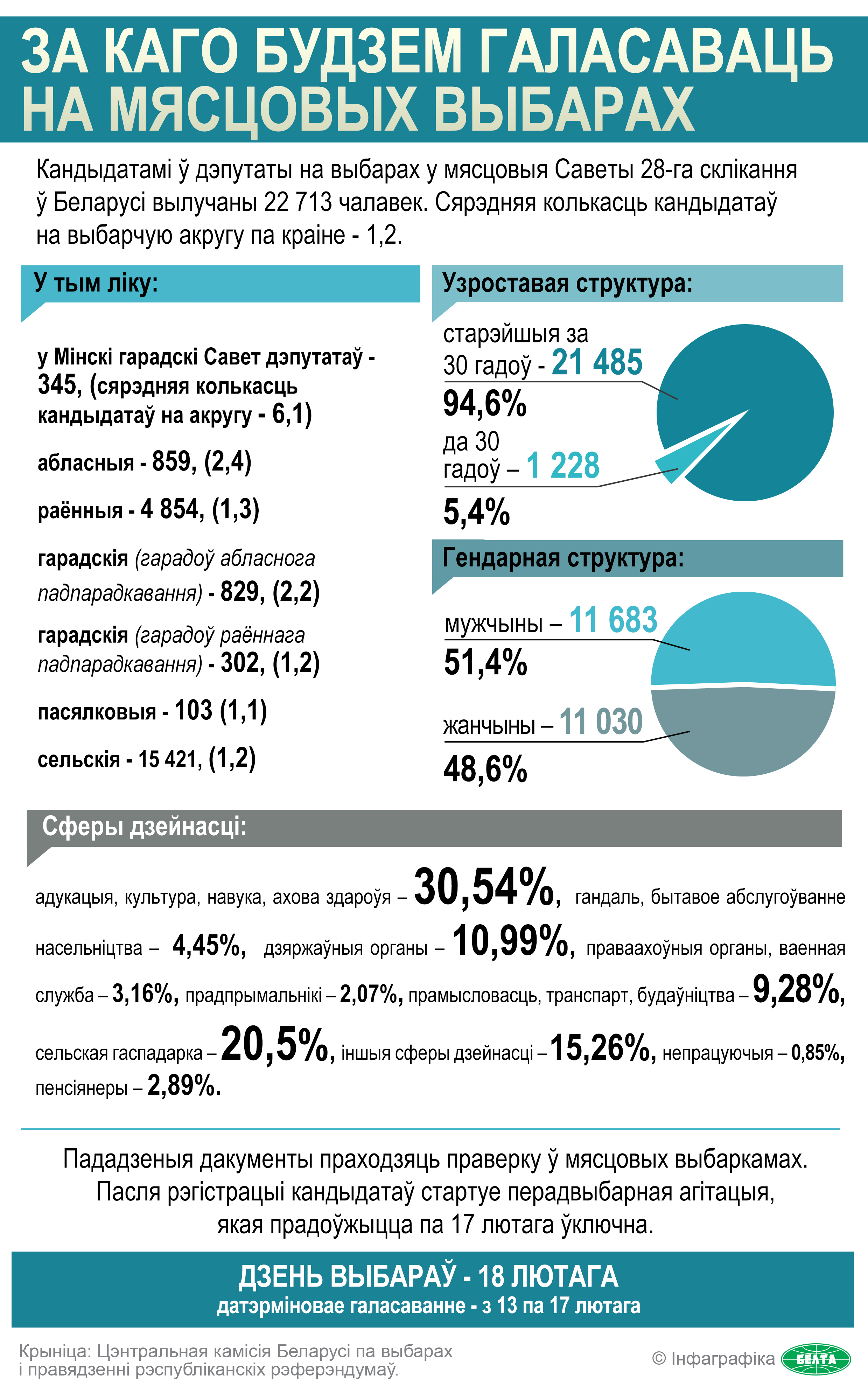 Мясцовыя выбары пройдуць у Беларусі 18 лютага, прагаласаваць датэрмінова можна будзе з 13 па 17 лютага. Па выніках вылучэння на 18 тыс. 111 дэпутацкіх мандатаў прэтэндавалі больш як 22,7 тыс. чалавек. У якасці кандыдатаў з іх зарэгістраваны 22 тыс. 278. Аднак не выключана, што бліжэй да даты выбараў гэта лічба можа зменшыцца.