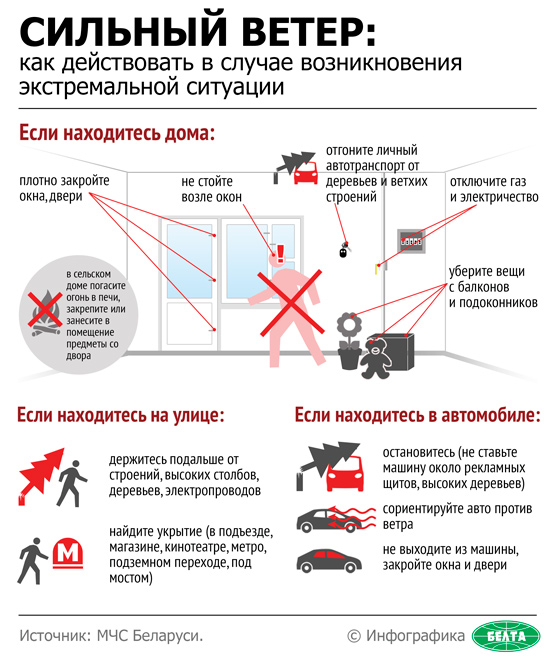 плотно закройте окна, двери, уберите вещи с балконов и подоконников, отключите газ и электричество, не стойте возле окон, отгоните личный автотранспорт от деревьев и ветхих строений, в сельском доме погасите огонь в печи, закрепите или занесите в помещение предметы со двора.