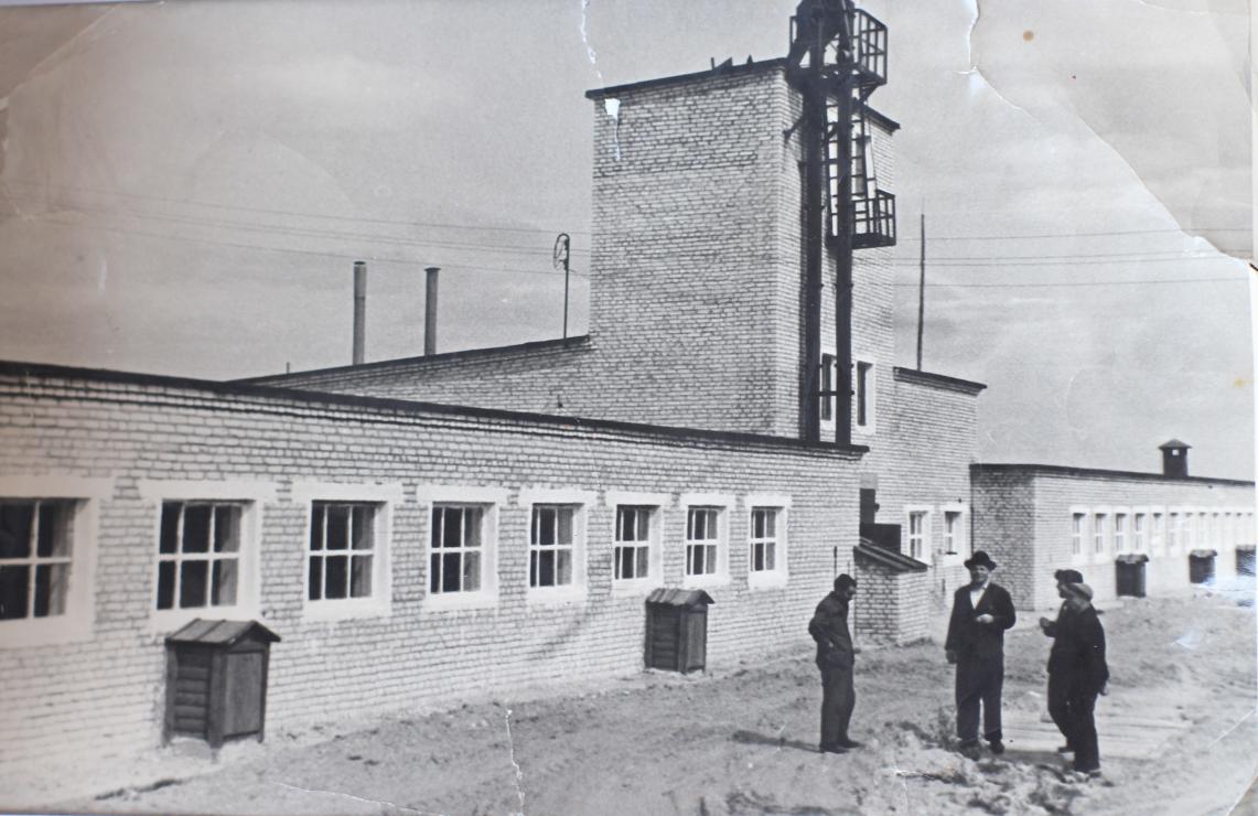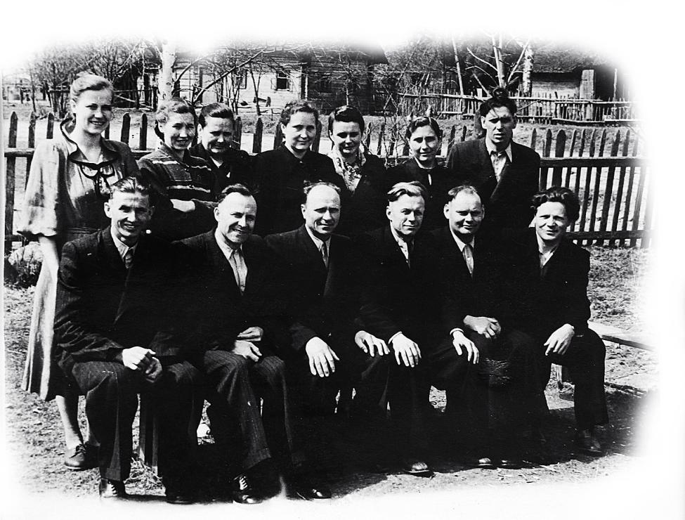 На шыльдзе надпіс: «Радзільны дом к-са імя Сталіна». У цэнтры П. Бычкоў, побач М. Такарчык і А. Булат.